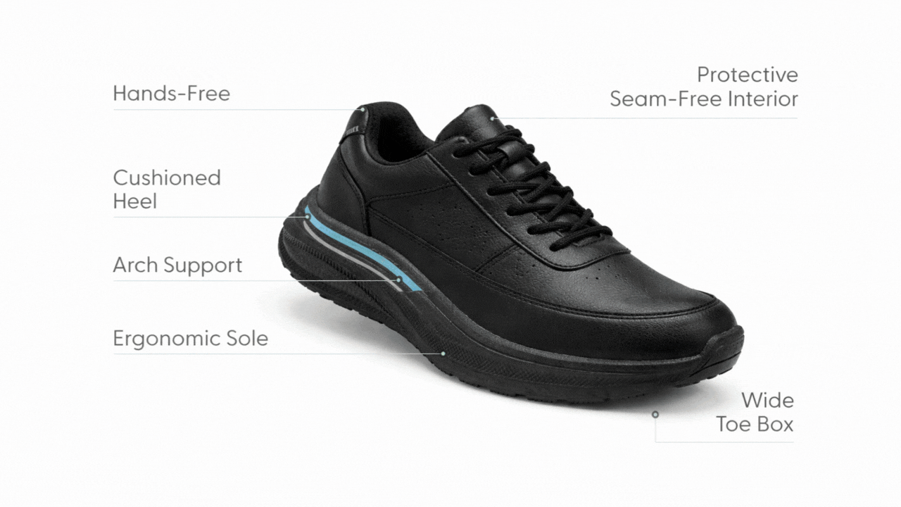 הגנה רכה לכפות רגליים רגישות פנים הנעל תוכנן להעניק נוחות והגנה מרבית, עם חומרים רכים ומרופדים המסייעים בהפחתת גירוי ולחץ לאורך כל היום. • בטנה חלקה ומרופדת מפחיתה חיכוך ואי־נוחות, ומתאימה במיוחד לעור רגיש • מבנה ללא תפרים מסייע במניעת שפשופים, שלפוחיות ונקודות לחץ • ריפוד תומך עוטף את כף הרגל ומספק נוחות מתמשכת תוך ספיגת זעזועים יומיומיים